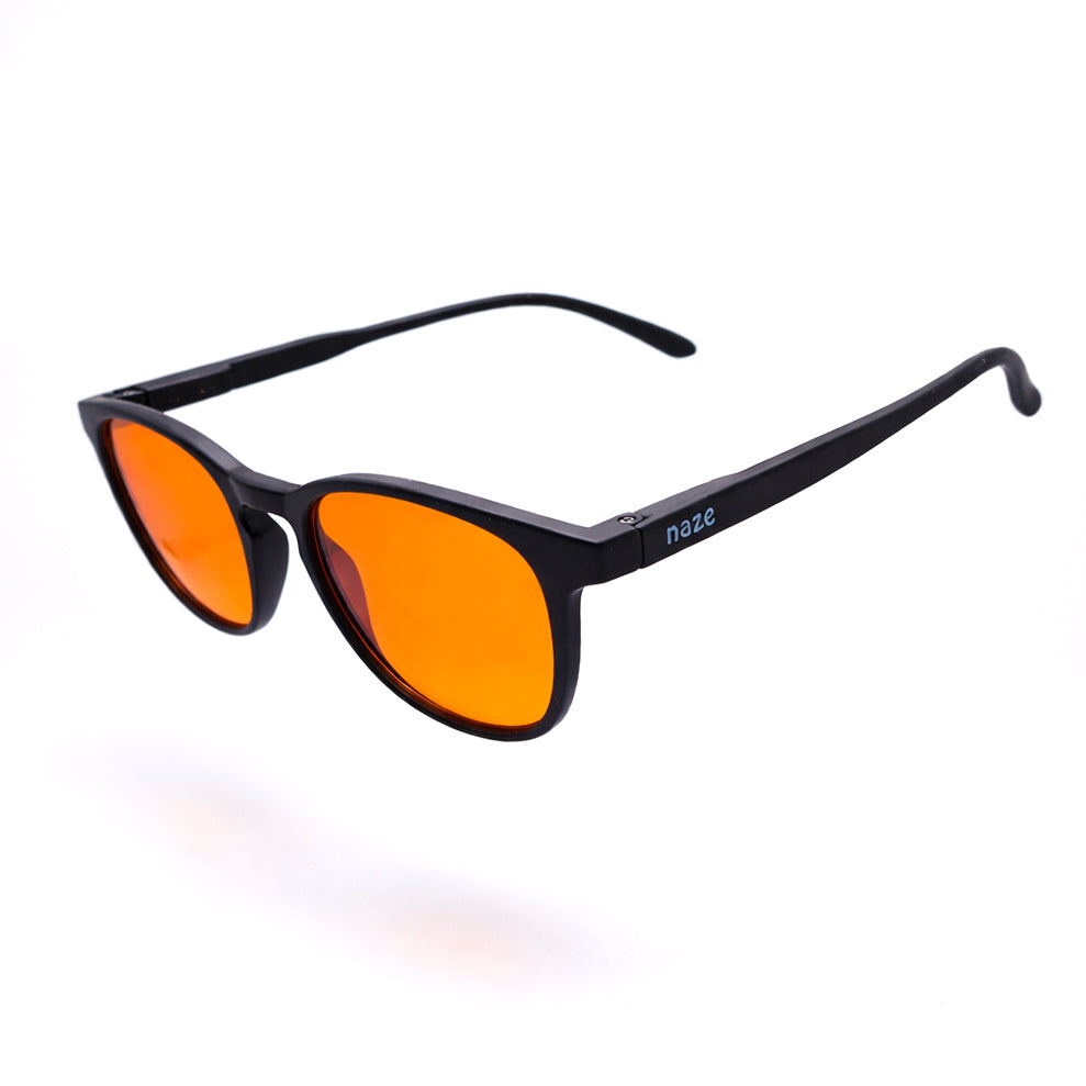 We use orange lenses to block 98 percent of blue light. This blocks the most disruptive wavelengths that disrupt sleep and cause eye strain.
